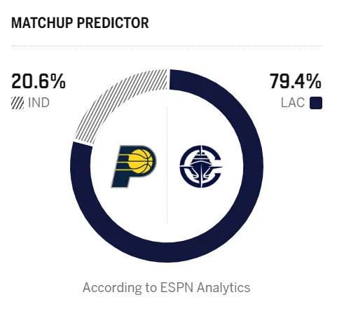 赛前,美媒ESPN预测本场比赛,快船胜率79.4%,步行者胜率20.6%。